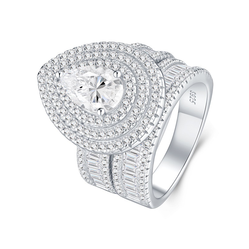 New dazzling pear-shaped fully paved moissanite ring set, sterling silver ring